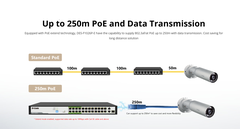 - Hỗ trợ cấp nguồn và truyền dữ liệu lên đến 250M (cổng 1-8) và lên đến 100M (cổng 9-16)